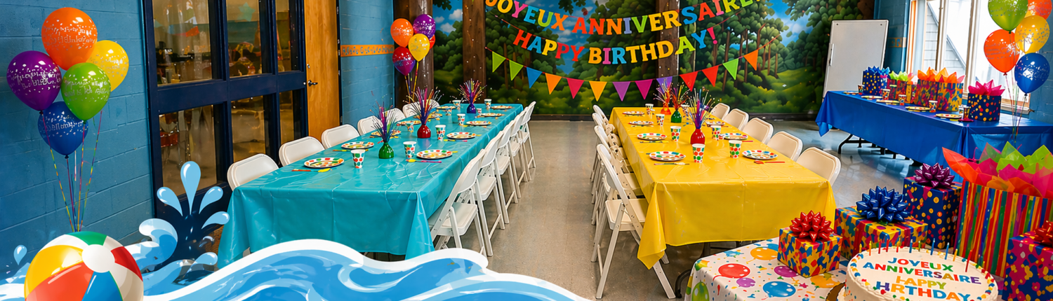 Les fêtes d’anniversaire combinent une location privée de piscine (tarif selon le nombre de baigneurs) ainsi qu’une location de salle située juste à côté de la piscine.