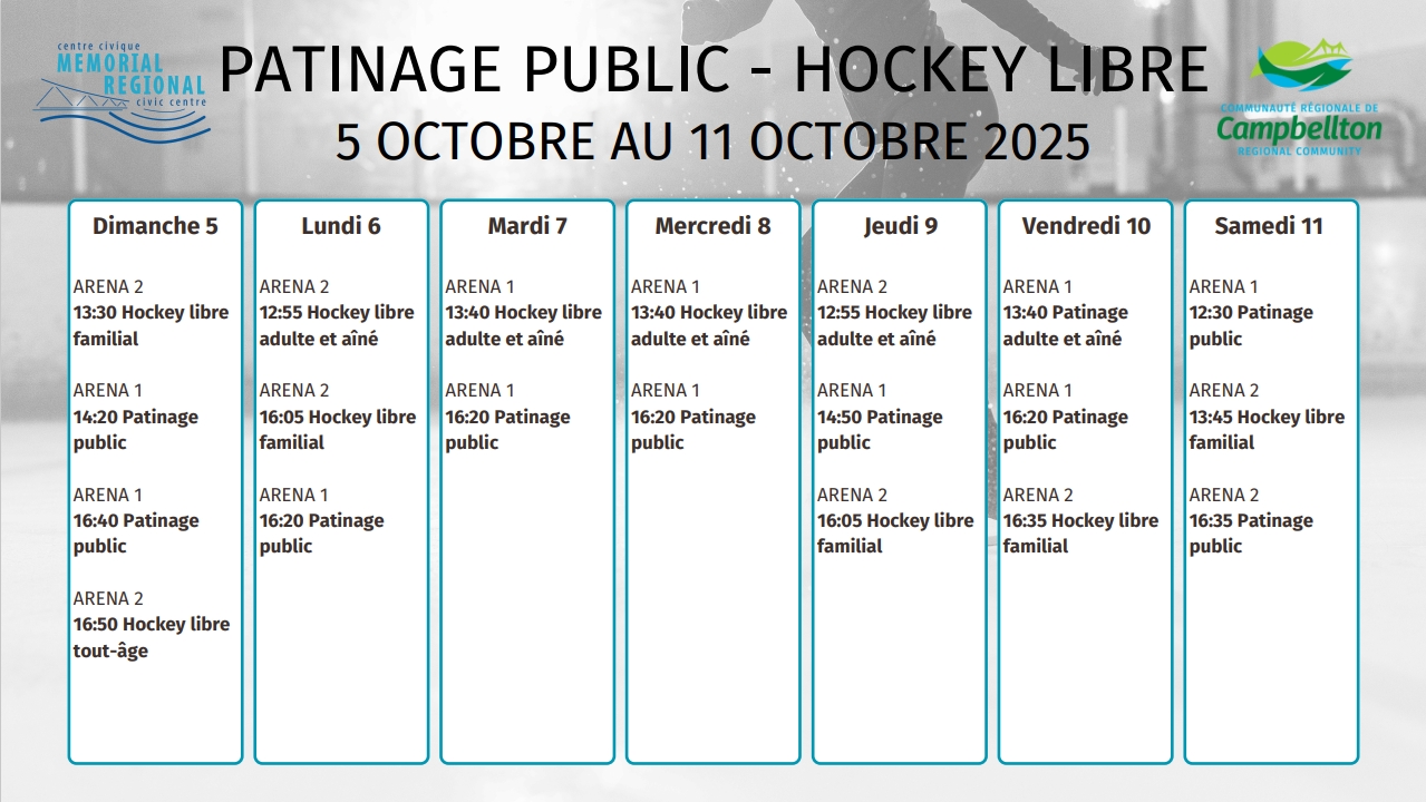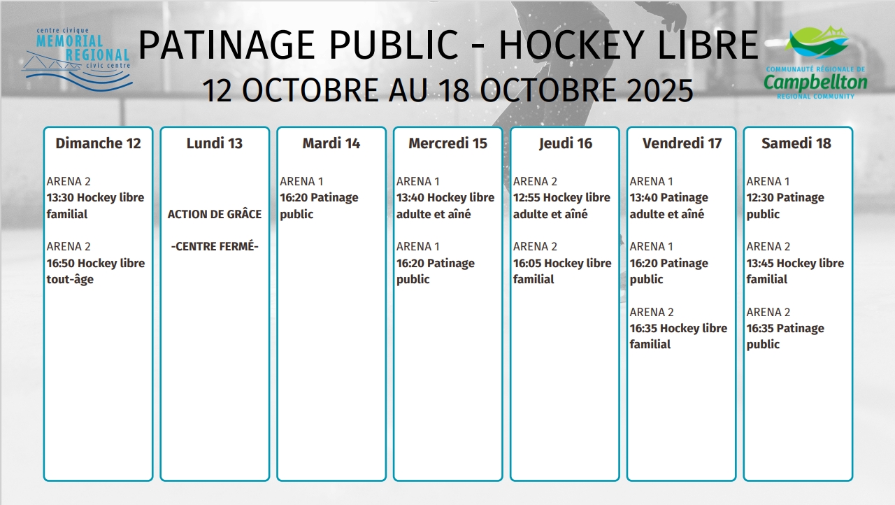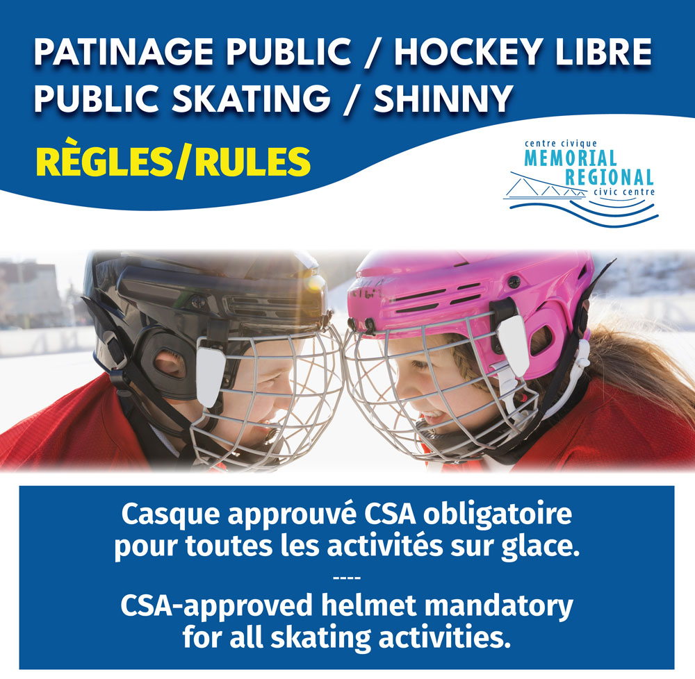 Le Centre Civique Memorial Regional est heureux d’annoncer son programme de patinage public et de hockey libre.